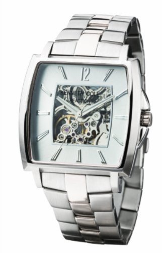 The lustrous stainless steel of this automatic watch from Kenneth Cole shines so brightly it will add unmatched, brilliant warmth to your business and formal wear. The smooth, classic lines of the 40-millimeter stainless steel case with beveled edges frames a silver-white dial with square cut-out, revealing the fascinating automatic movement of this timepiece. The silver indexes and Arabic numeral are large and vivid for quick and easy reference, and all of the delicate inner workings, colored in gleaming silver and gold tones, are protected by a mineral crystal. To complete the eye-catching look of this elegant watch, a gleaming 20-millimeter stainless steel, bracelet-style band, with a pushbutton clasp, secures it to your wrist. This watch is water resistant to 99 feet. RelateItems- Kenneth Cole New York Men's KC3771 Automatic Watch